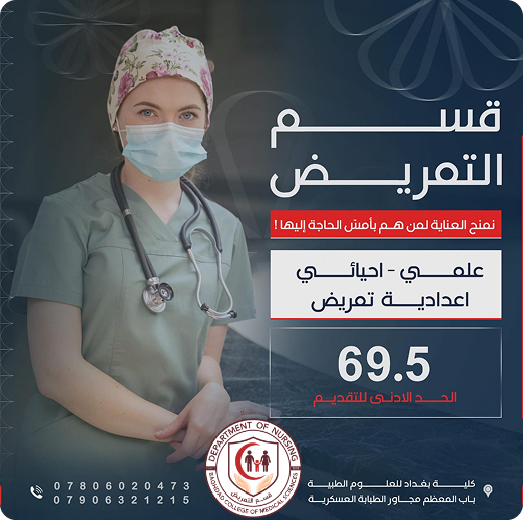 يُعد قسم التمريض من الأقسام الحيوية في الكلية، وقد تم تأسيسه استجابةً للحاجة المتزايدة إلى كوادر تمريضية مؤهلة علميًا وعمليًا. يهدف القسم إلى إعداد ممرضين وممرضات يمتلكون الكفاءة والمعرفة اللازمة لتقديم رعاية صحية شاملة على المستويين الوقائي والعلاجي، داخل المؤسسات الصحية في العراق وخارجه. ويعتمد البرنامج على مزيج متكامل من التعليم النظري والتدريب العملي السريري داخل المستشفيات والمراكز الطبية، مما يمنح الطلبة تجربة تعليمية متوازنة تؤهلهم بجدارة لسوق العمل في المجال الصحي.